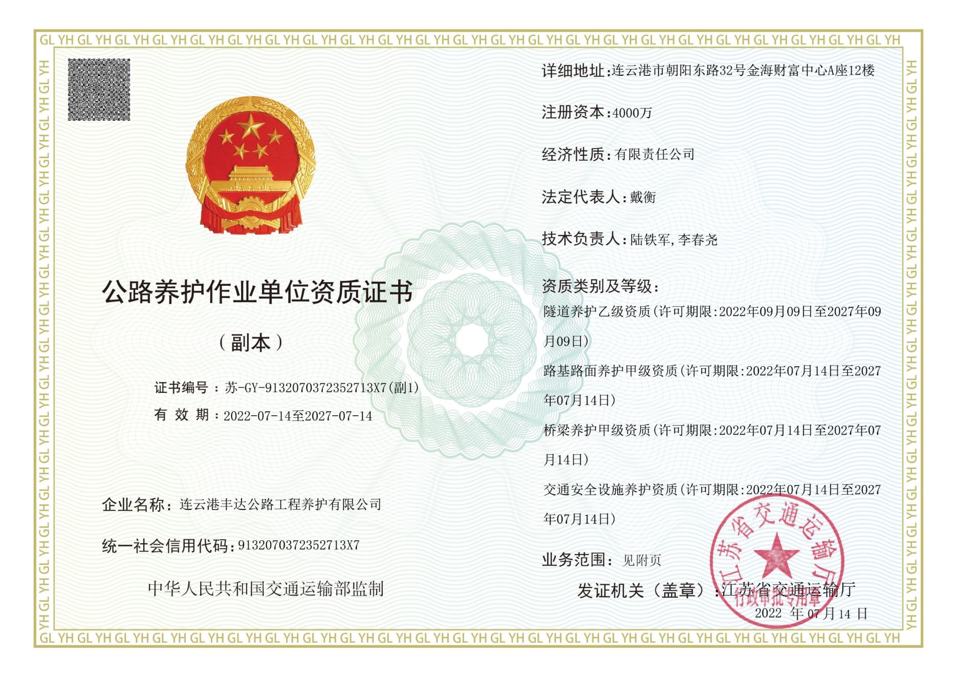 目前,丰达公司已获得隧道乙级、路基路面养护甲级、桥梁养护甲级、交安设施养护四项资质,实现了养护业务范围的不断拓展和延伸。下一步公司将持续发力,不断优化资质体系,提高养护作业能力和水平,为企业长远发展打下坚实基础。