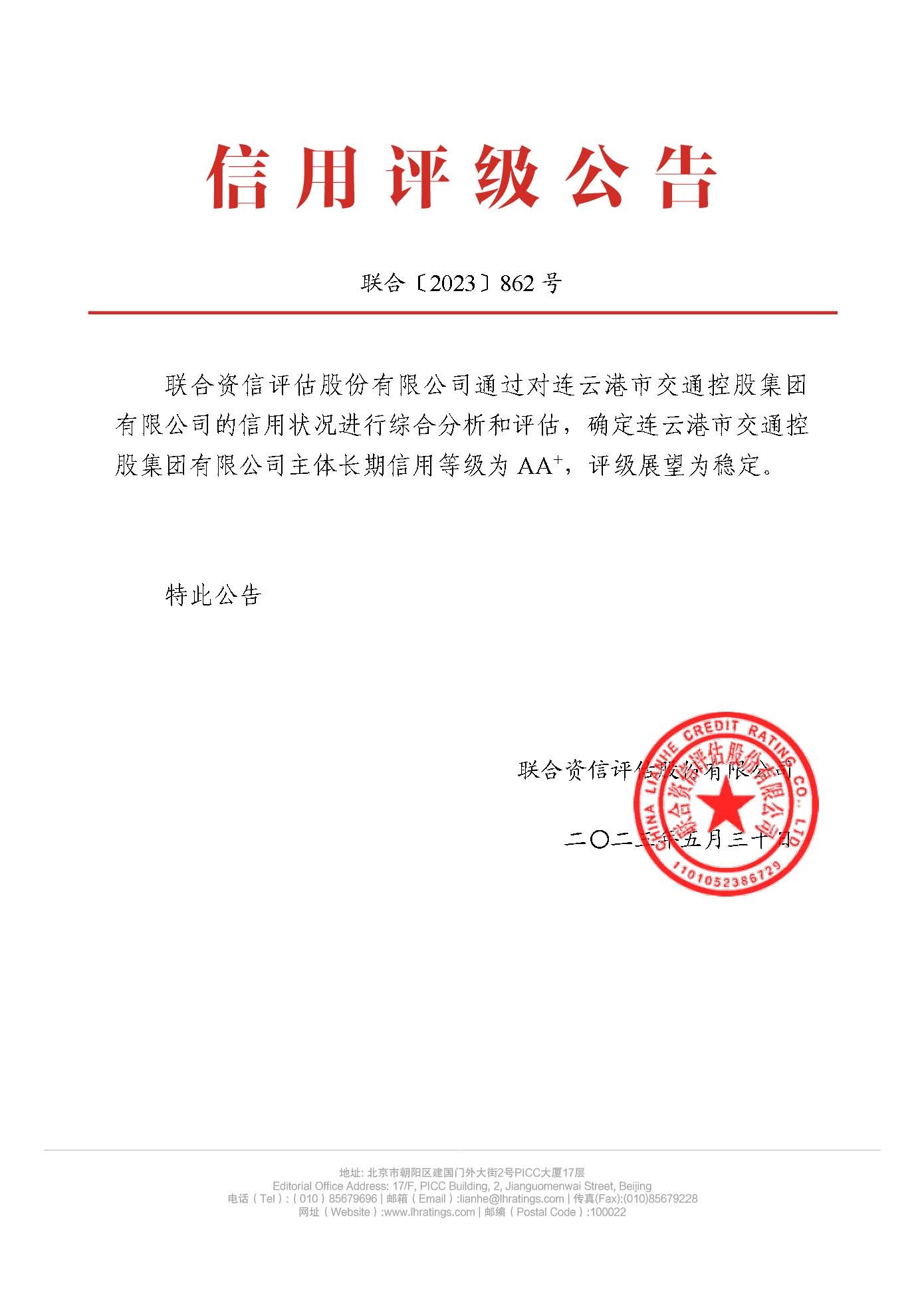 近日,联合资信评估股份有限公司发布信用评级公告,确定安博app最新版下载,安博(中国)(以下简称“交通控股安博app最新版下载,安博(中国)”)主体长期信用等级为AA+,评级展望为稳定。