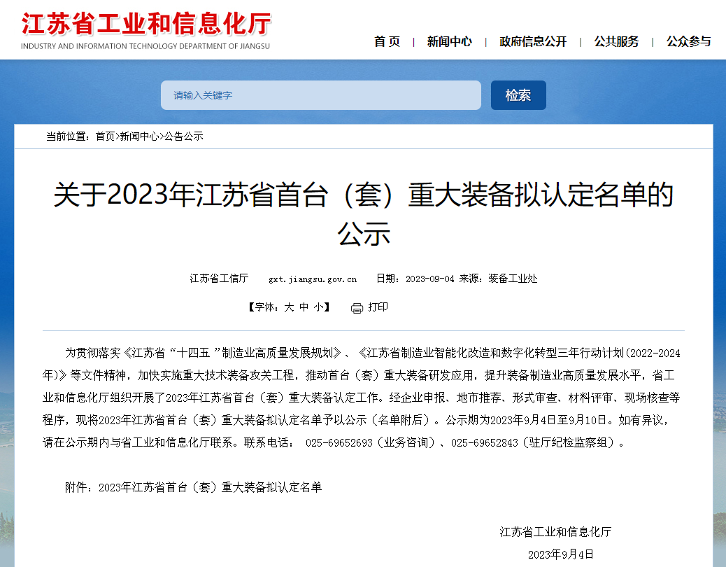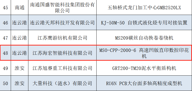 近日,江苏省工业和信息化厅公示了2023年江苏省首台(套)重大装备拟认定名单。市交通控股安博app最新版下载,安博(中国)权属江苏海宏智能科技有限公司(以下简称海宏科技)的MSO-CPP-200-6高速凹版直印数控印花机在参评项目中脱颖而出,成功入选。