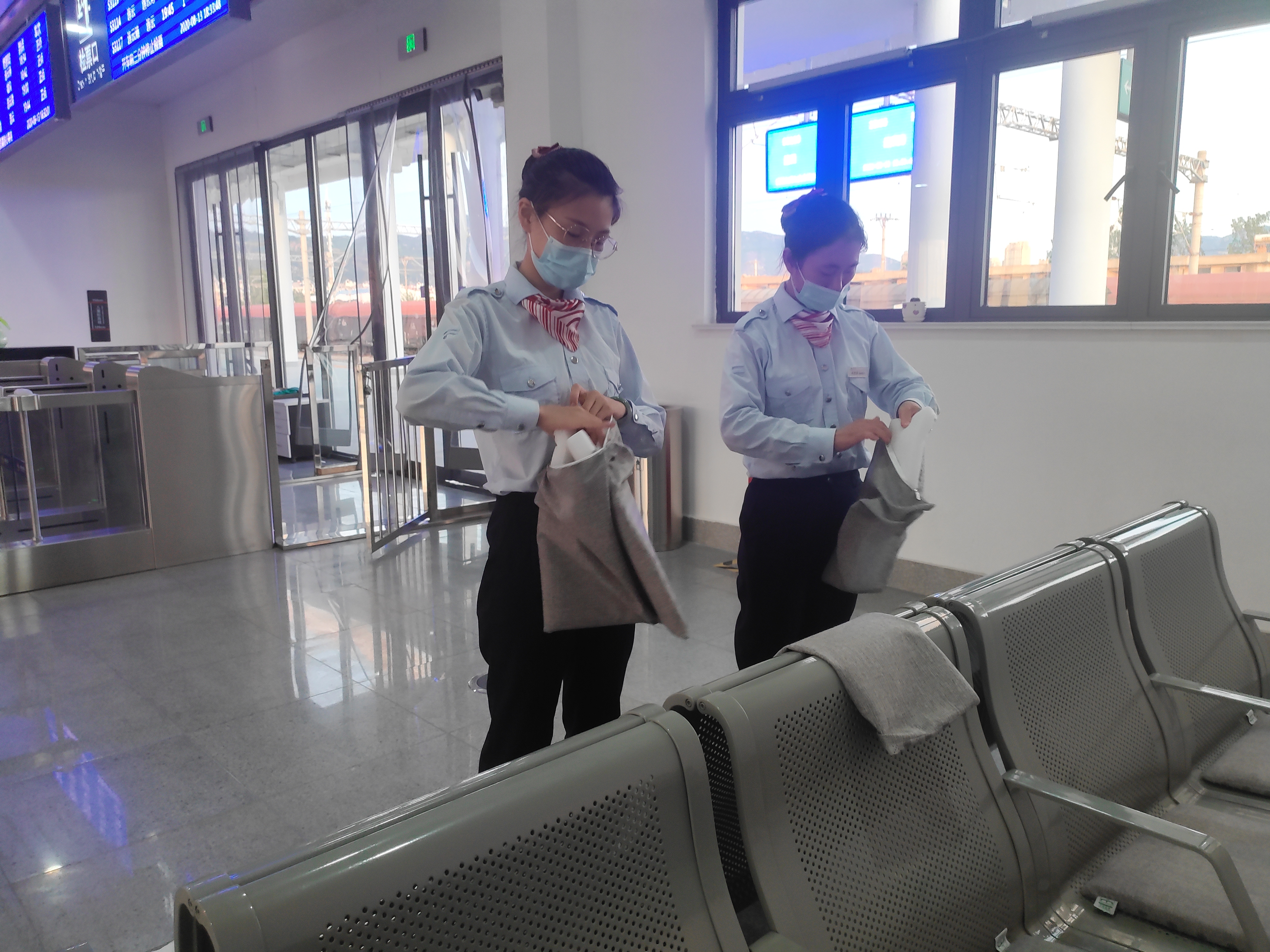 疫情当前,城市动车站作为人口流动和聚集较多的地点对疫情防控更是一刻不敢松懈。为每一位乘客做测温登记,检查健康码,定时对候车厅打扫消毒,城市动车组把疫情防控落到实处。为了乘客多一分安心与踏实,城市动车的保洁和站务员们配合一起对候车厅座椅上座垫进行了清洗,站务组的姑娘们带好手套,对每一个座垫仔细清洗消毒。连云站站长孙晓婷在面对乘客问询时,她说:“候车厅的座椅是乘客进站后的第一歇脚处,座椅我们每天早晚都消毒一次,而坐垫与乘客直接接触,我们更应该要定期清洗,既让乘客感到洁净舒适,也是我们对疫情防控贡献自己的一份力量。”