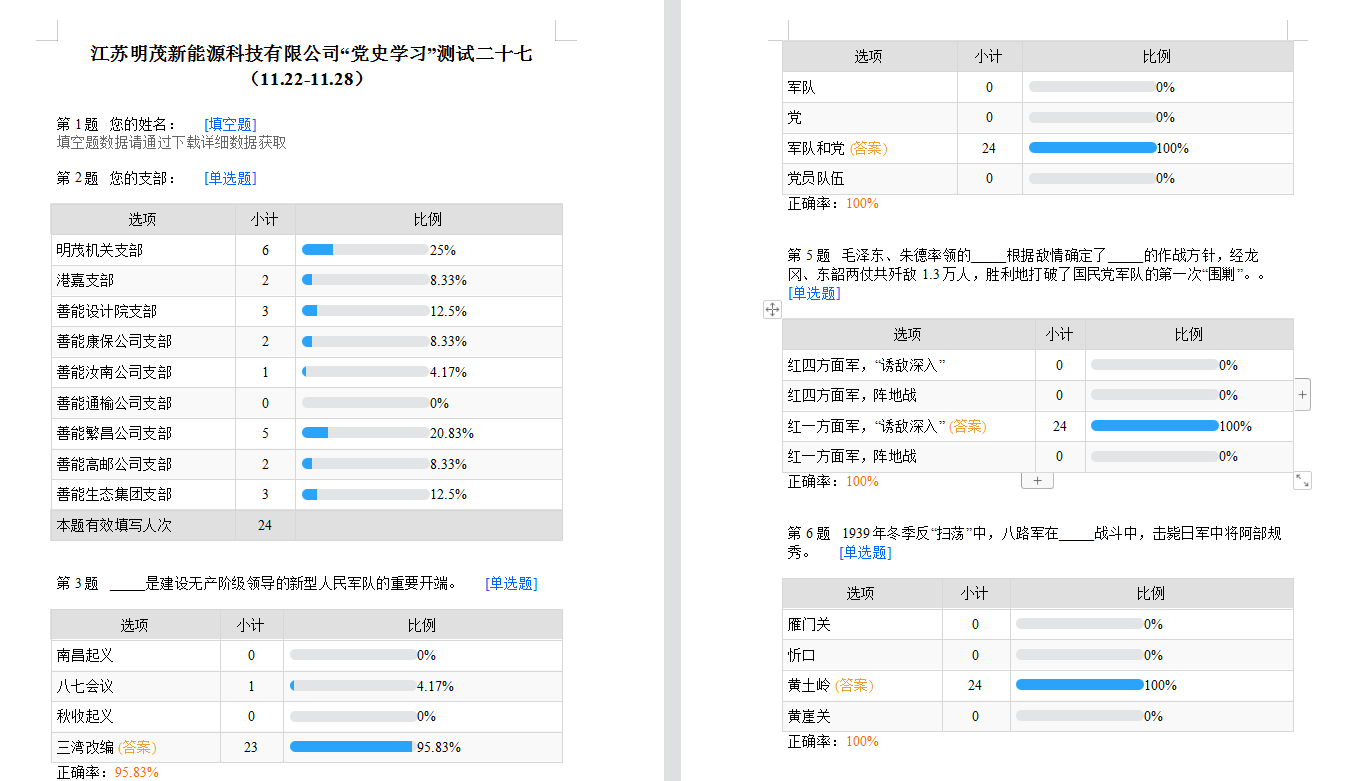 为深入开展党史学习教育,创新党史知识学习的方法和途径,营造更加浓厚的学习氛围,让党史学习教育“活”起来,明茂公司积极拓宽党史学习渠道,强化学习覆盖面和参与度,创新理论学习方式,以一部手机为依托每周开展微信党史线上答题测试,通过融入知识性、趣味性、便捷性为一体的知识测试,及时跟踪个人测试情况,利用碎片时间,随时随地检验学习成果,截止目前已开展28期。