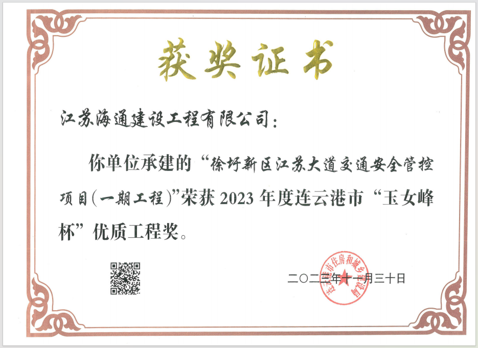 近日,从连云港住房和城乡建设局获悉,江苏海建公司徐圩新区江苏大道交通安全管控项目(一期工程)荣获2023年度连云港市“玉女峰杯”优质工程奖。