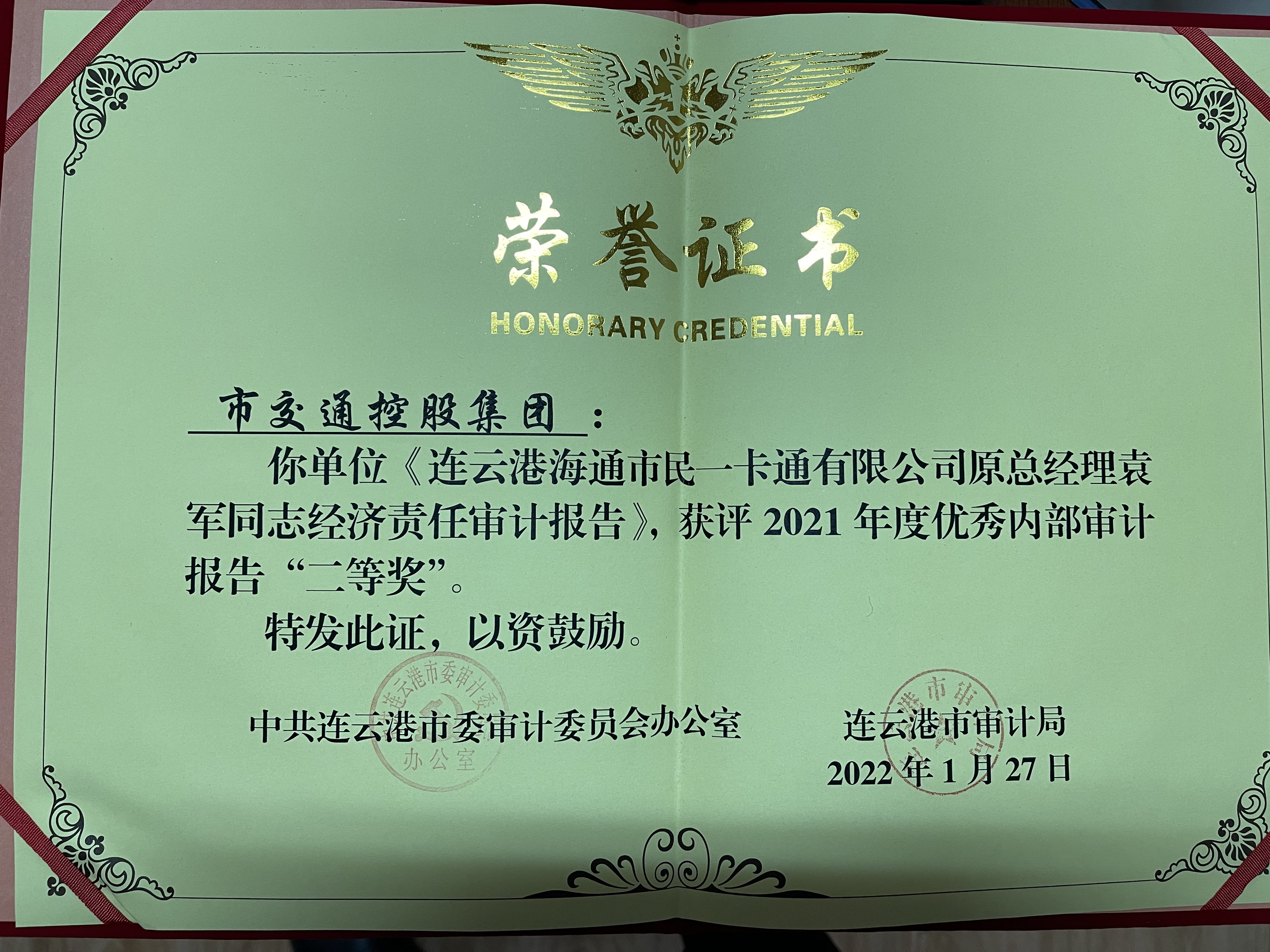 近日,安博app最新版下载,安博(中国)审计部出具的审计报告——《连云港海通市民一卡通有限公司原总经理袁军同志经济责任审计报告》,在审计局组织有关人员对2021年度全市内部审计报告开展评选工作中获得连云港市委审计委员会和连云港市审计局共同颁发的2021年度优秀内部审计报告“二等奖”。
