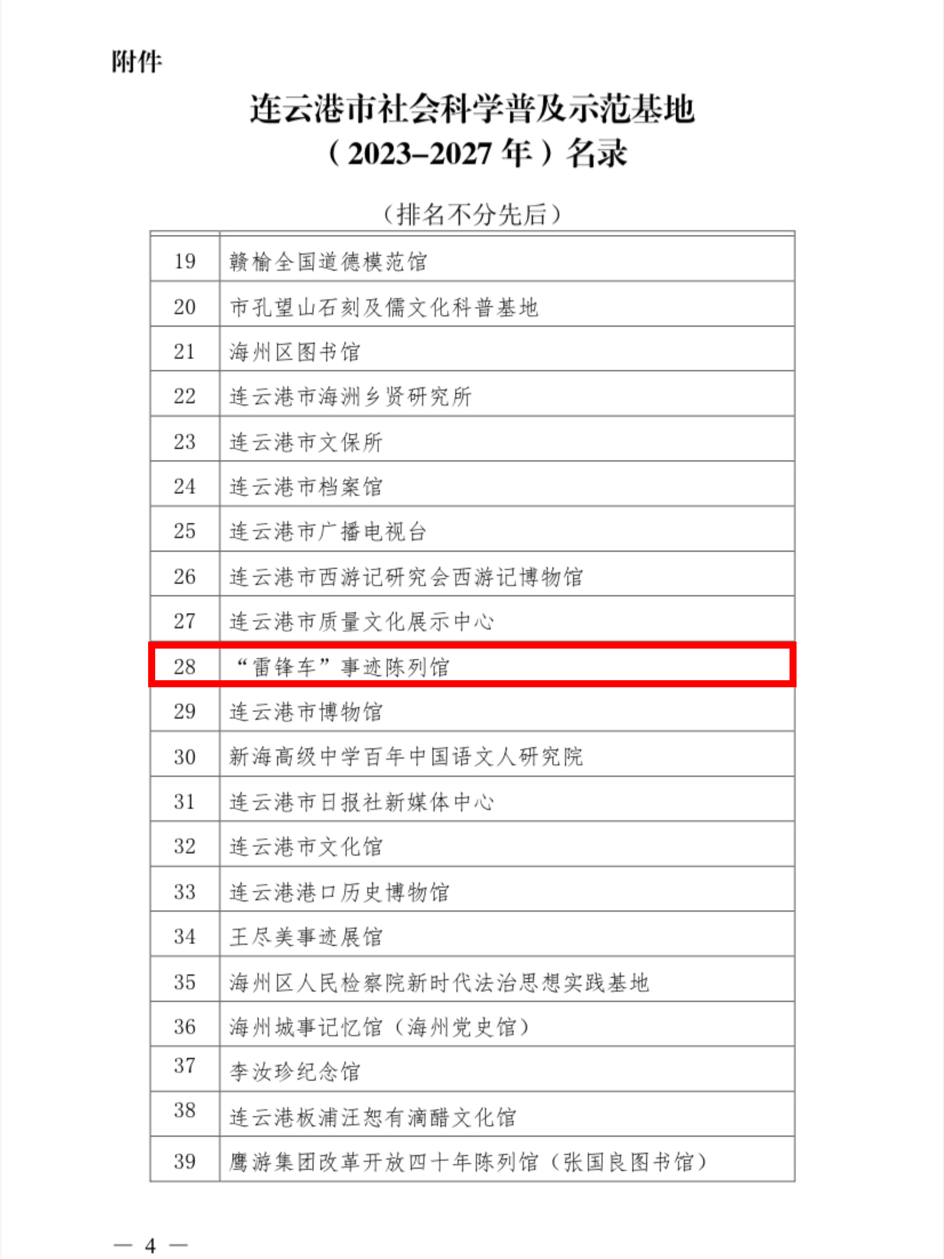 近日,连云港市哲学社会科学界联合会公布连云港市社会科学普及示范基地 (2023-2027年)名录,“雷锋车”事迹陈列馆榜上有名。