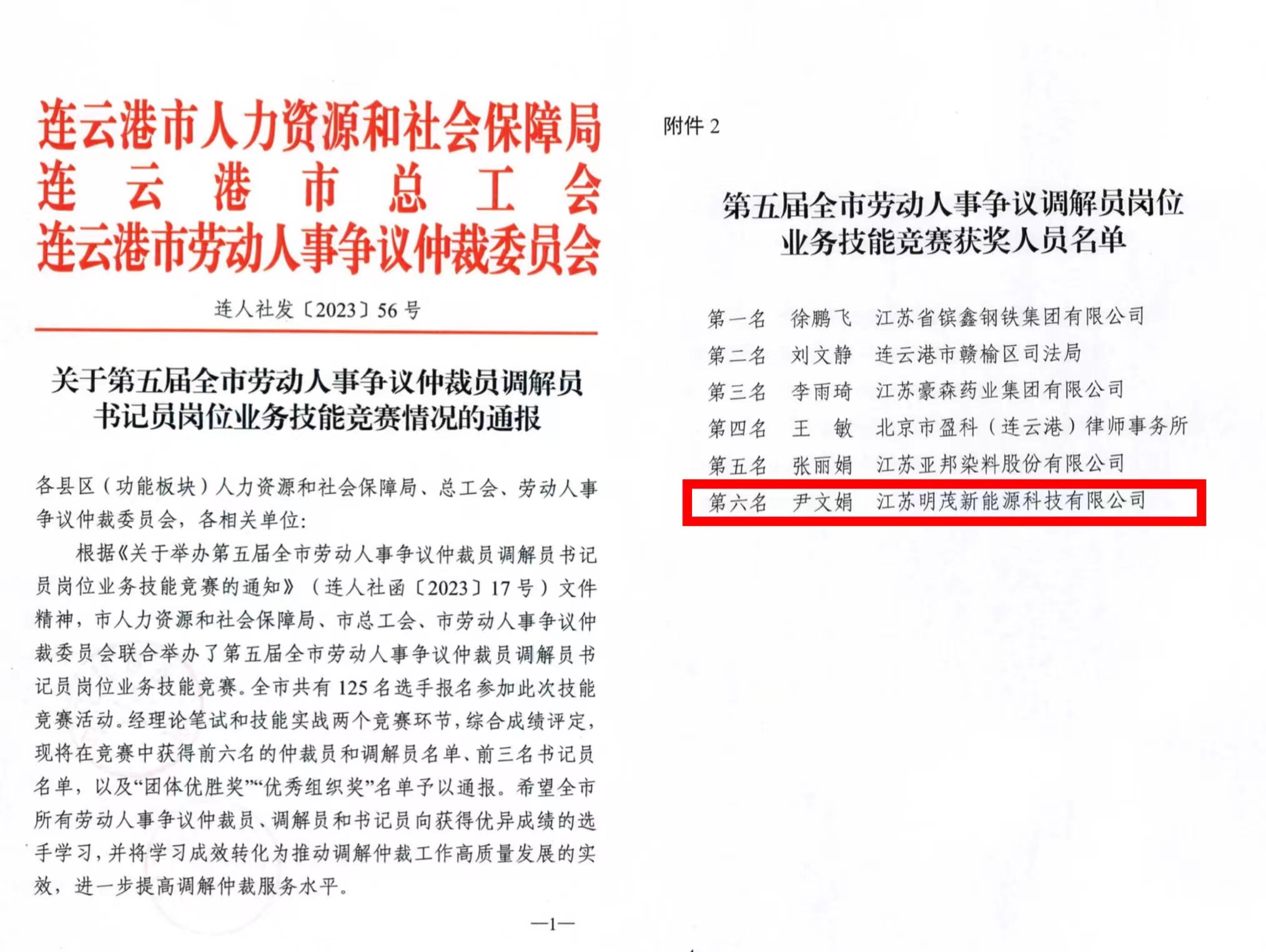近日,连人社印发《关于第五届全市劳动人事争议仲裁员调解员书记员岗位业务技能竞赛情况的通报》,对23个获奖选手、代表队及优秀组织者进行了表扬。明茂公司尹文娟荣获全市劳动人事争议调解员岗位技能竞赛三等奖。