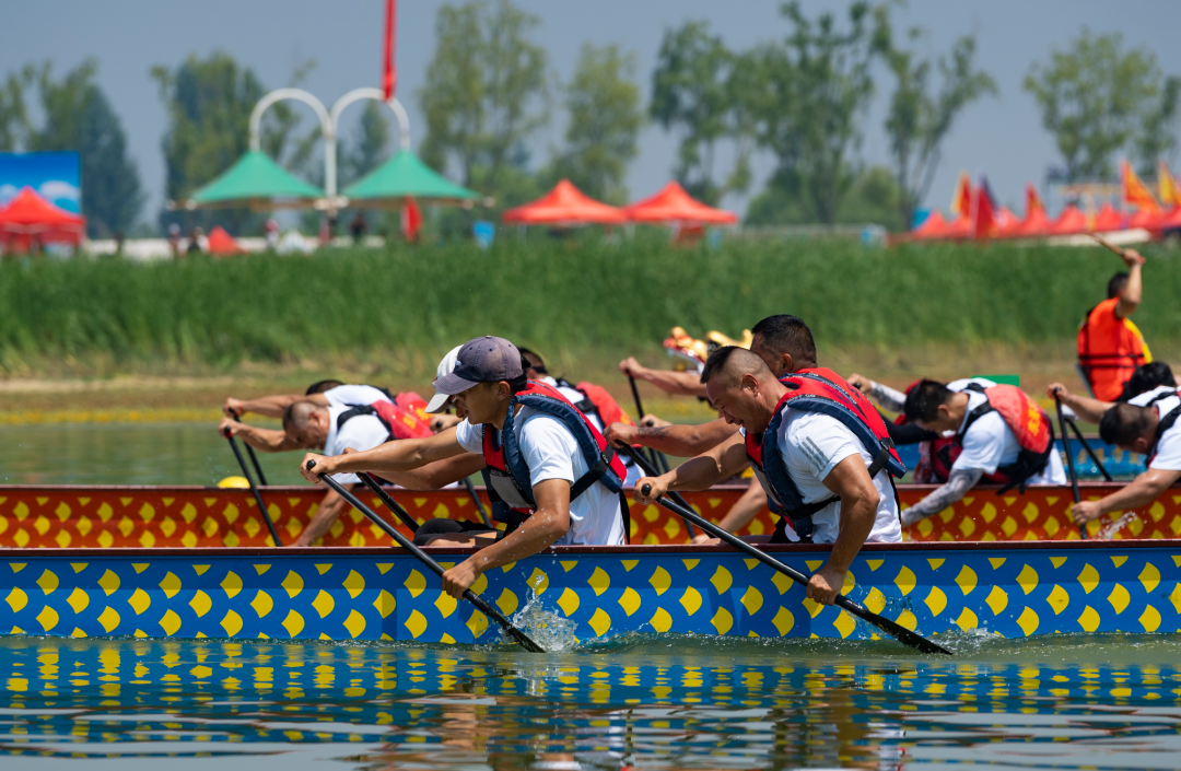 上午9点半,随着一声响亮的发令枪响,龙舟竞渡正式开始!选手们击水奋楫,劈波斩浪,向终点冲去,岸边响起观众排山倒海的助威呐喊声。飞溅的浪花、飞舞的龙旗、飞驰的龙舟,整齐划一的锣鼓声和场边观众的呐喊声使现场气氛瞬间升至沸点。