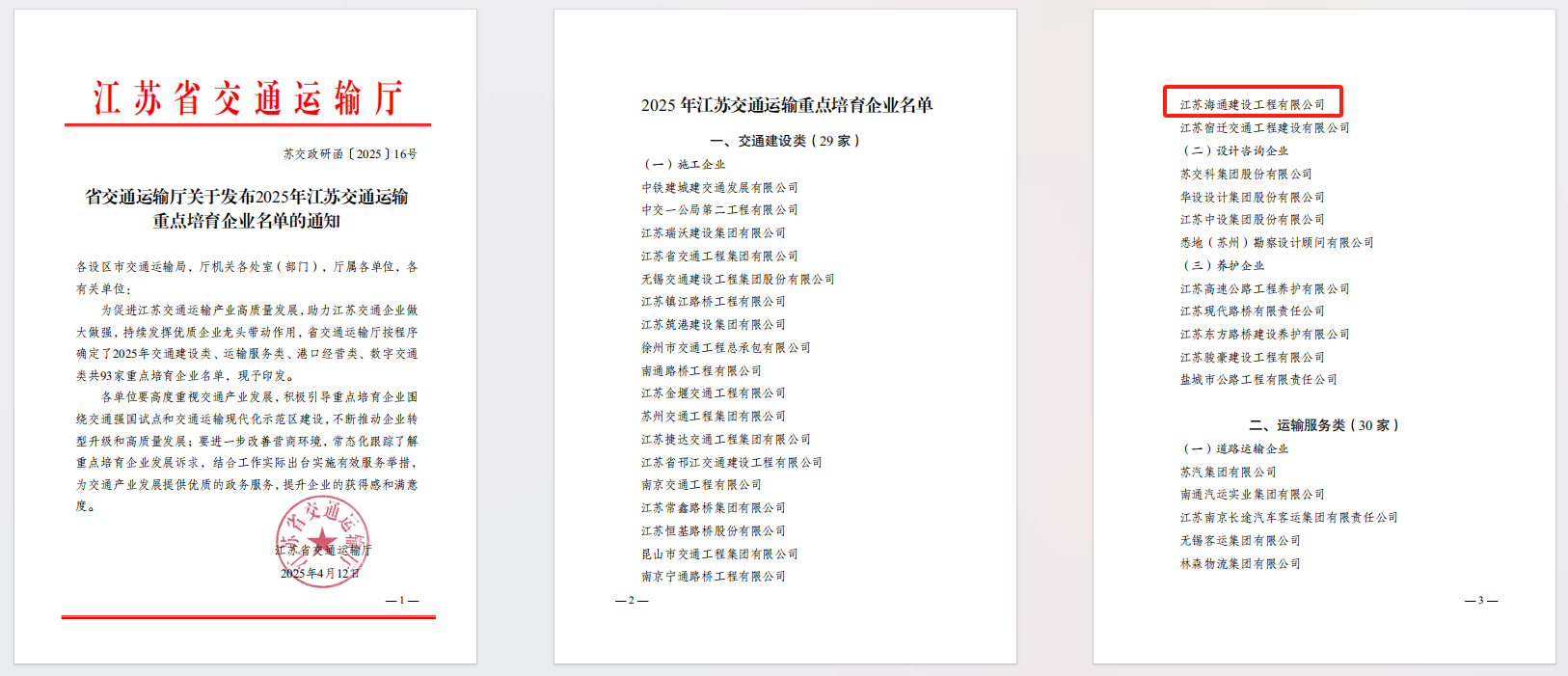 近日,从江苏省交通运输厅获悉,江苏海建公司入选2025年江苏交通运输重点培育企业名单,位列交通建设类施工企业20强。