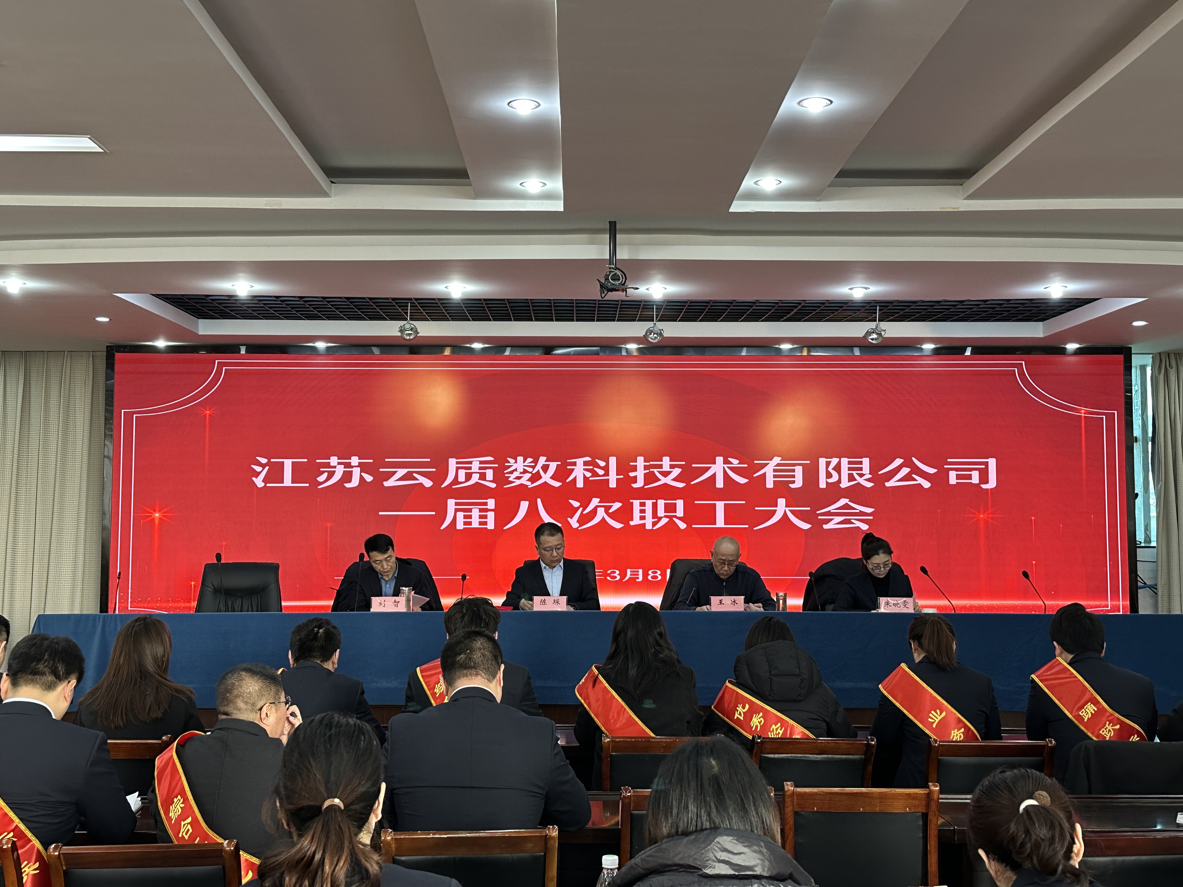 2025年3月8日上午9时,江苏云质数科技术有限公司2025年度一届八次职工大会隆重召开。公司全体职工齐聚一堂,共商企业发展大计,擘画新一年蓝图。会议由朱晓雯主持,党支部书记、董事长陈琛作重要讲话。