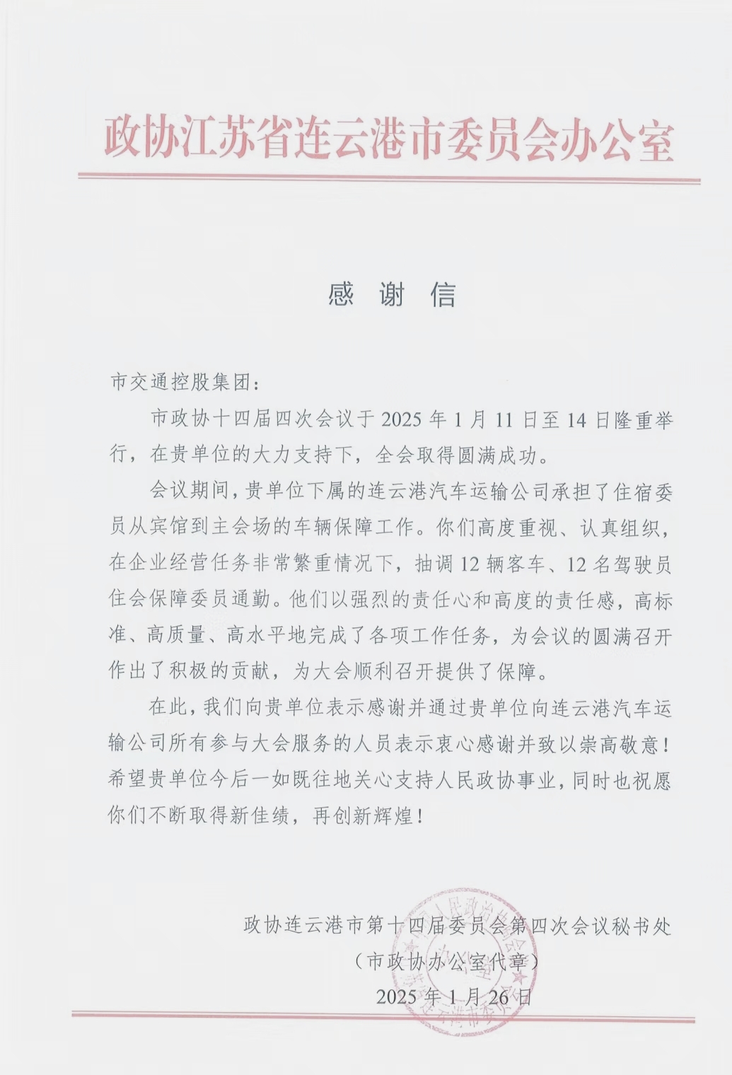 政协连云港市第十四届委员会第四次会议秘书处在感谢信中,不仅向市交通控股安博app最新版下载,安博(中国)所属的连云港汽车运输有限公司表达诚挚谢意,还向所有参与服务的人员致以崇高敬意。