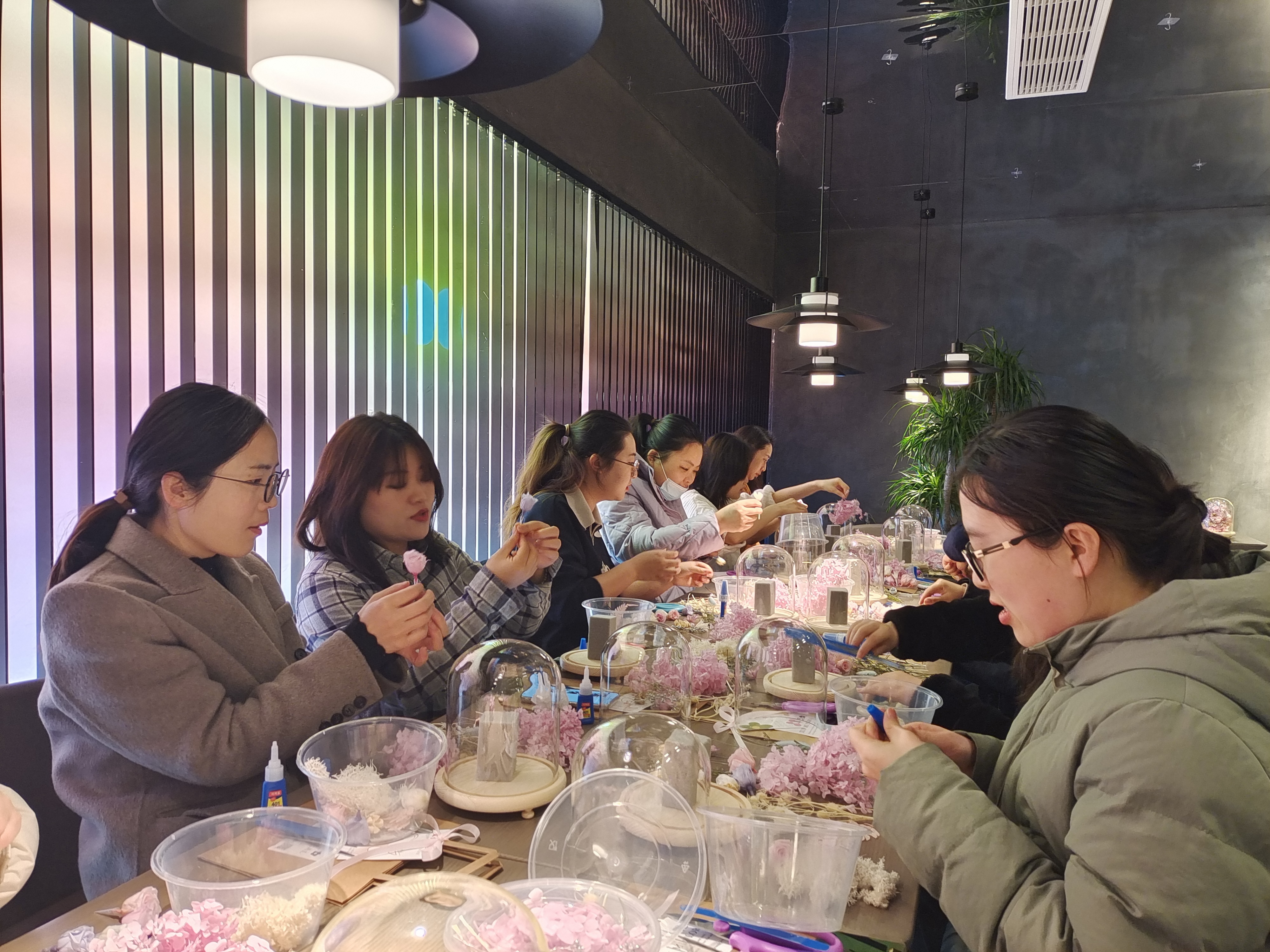 三月拂暖风,巾帼展笑颜。本次活动以永生花艺学习的形式开展,活动伊始,老师讲解了永生花插花的方法和技巧,为大家发放了永生花、剪刀、胶水及展示玻璃罩。随后,女职工们便迫不及待地开始了自己的创作之旅,各自小心翼翼地挑选着心仪的花材,精心设计配色,时不时相互交流心得,分享彼此收获,指导老师也加入其中,为他们答疑解惑。活动现场笑语盈盈,在轻松愉快的氛围中,一个个清新雅致而又独具风格的永生花作品在一双双灵巧的手中诞生。