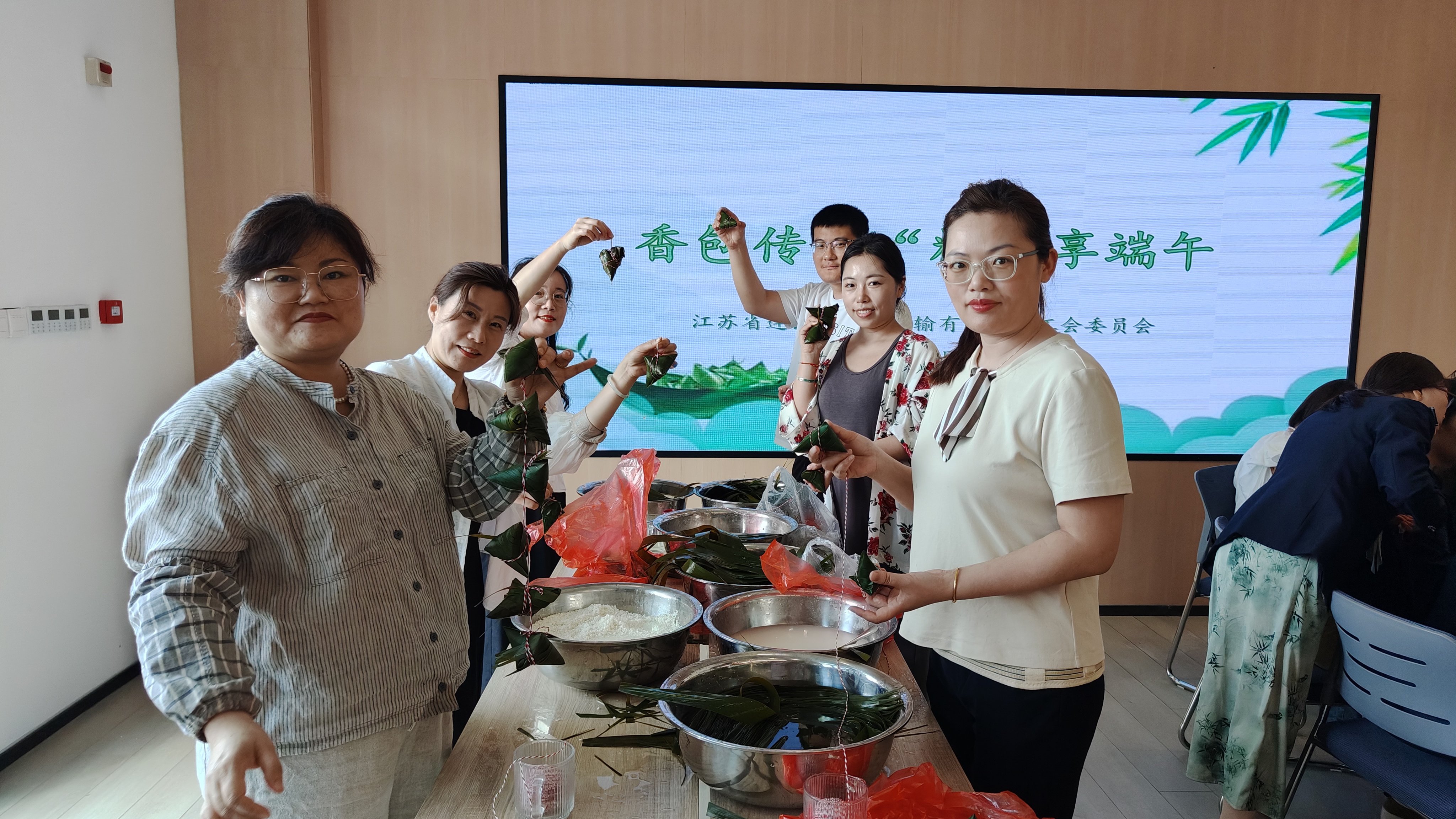 工作人员提前准备好粽叶、糯米、红枣、粽绳等必备材料,大家自行分组,裹粽叶、填糯米、放蜜枣、扎线口,会包的一板一眼,不会包的现学现用,互相分享着包粽子的经验,有说有笑,其乐融融。不一会儿,一片片粽叶、一粒粒糯米,在她们灵巧的双手中变成一个个三角形、长条形等各式各样的精致粽子。参加活动的员工满载而归,现场充满了欢乐的气氛。
