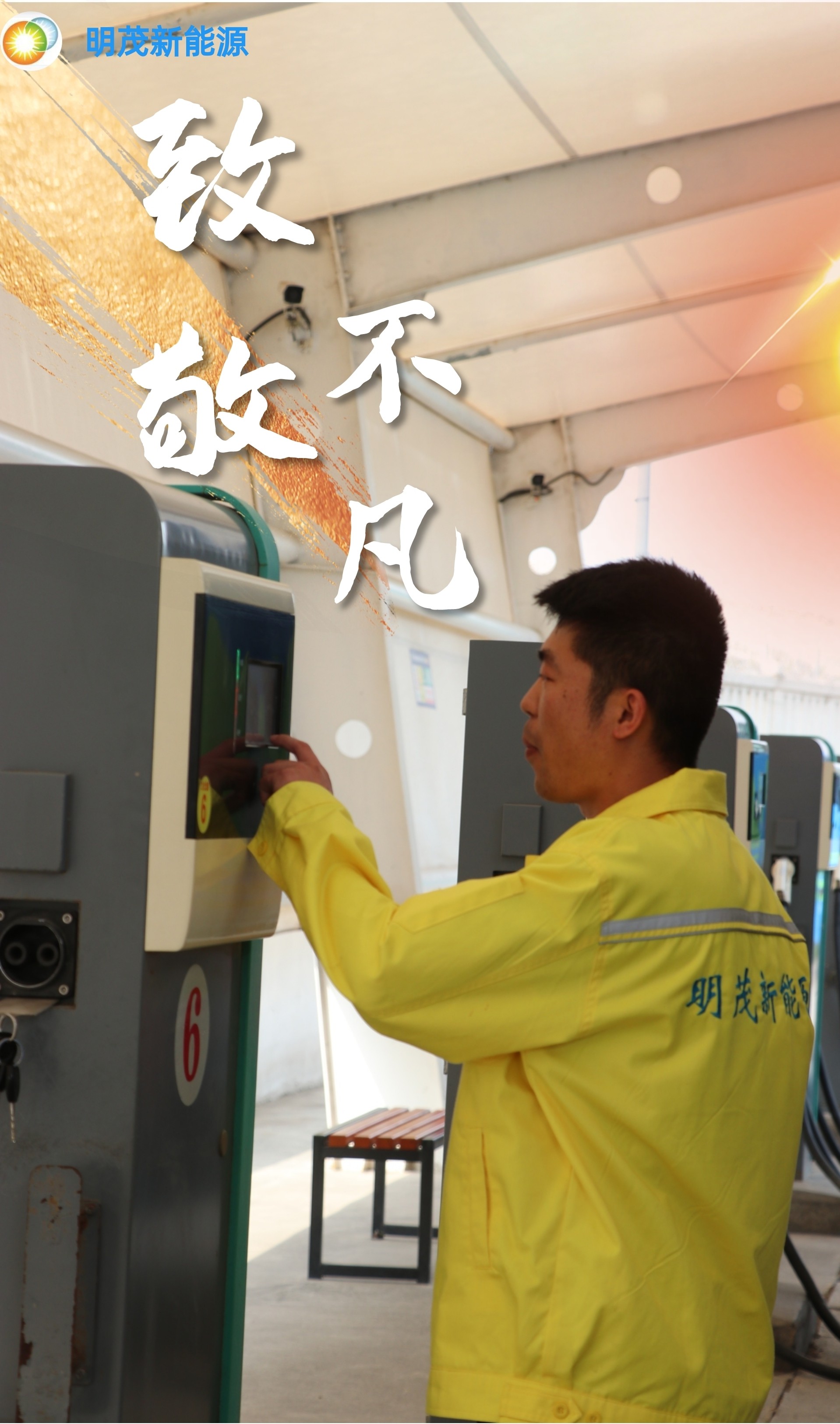老孟师傅是明茂公司西城充电站的一名工作人员,今年52岁,每天早上6点,他的工作就开始忙碌起来。他身穿防静电工作服,引导车辆有序停放到充电区域后,右手握住充电枪,拇指按住充电枪卡簧,从充电桩上拔下充电枪,转身移至新能源公交车充电箱,将充电枪插入充电接口,听到“咔啪”一声,再转身观察充电桩液晶显示屏,确认显示正常后,进行操作、刷卡,开始充电。